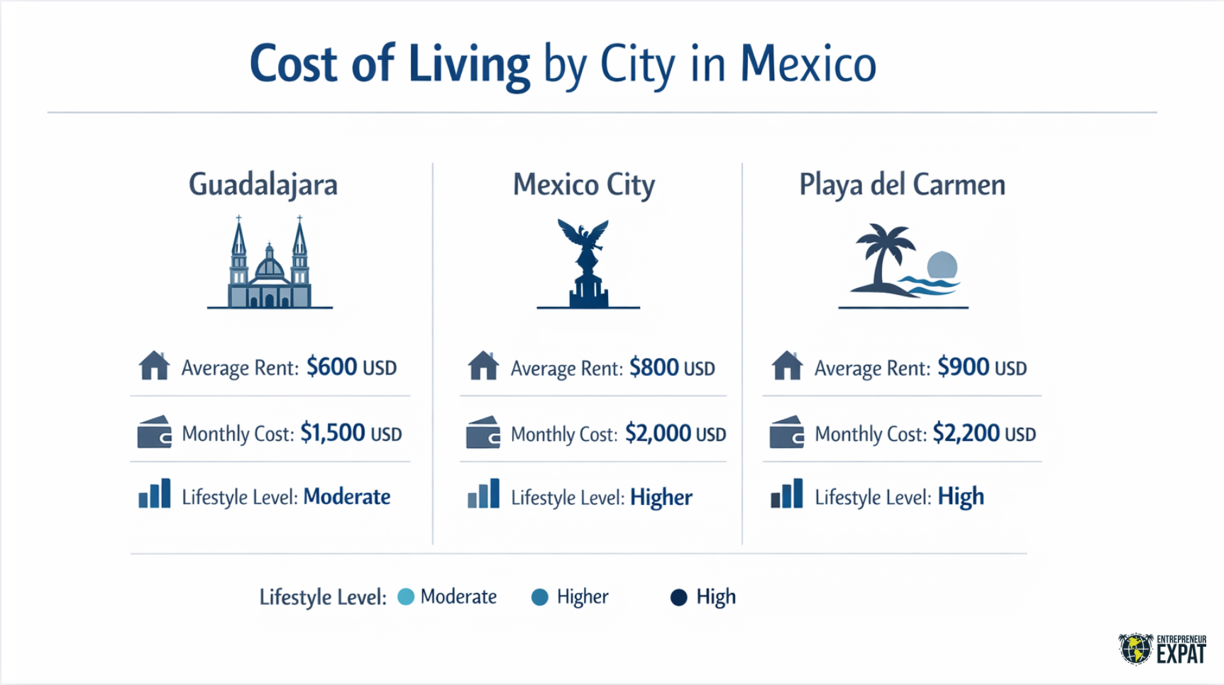 The best places to live in Mexico for expats depend on what kind of value you want. Some people want lower rent. Others want better weather, healthcare, walkability, a large expat community, or proximity to an international airport. Cities like Guadalajara, Mexico City, Playa del Carmen, and Lake Chapala all offer different cost-of-living tradeoffs.